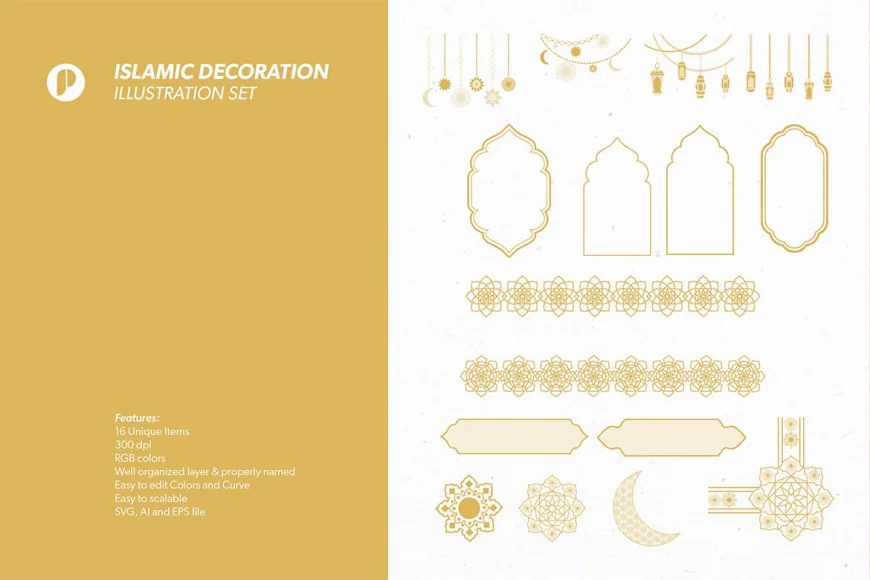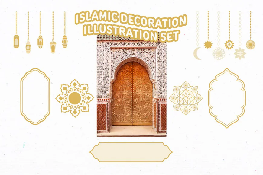 This elegant set of illustrations with Islamic decor will be an ideal choice for creating Islamic greeting cards, social media templates, banners.